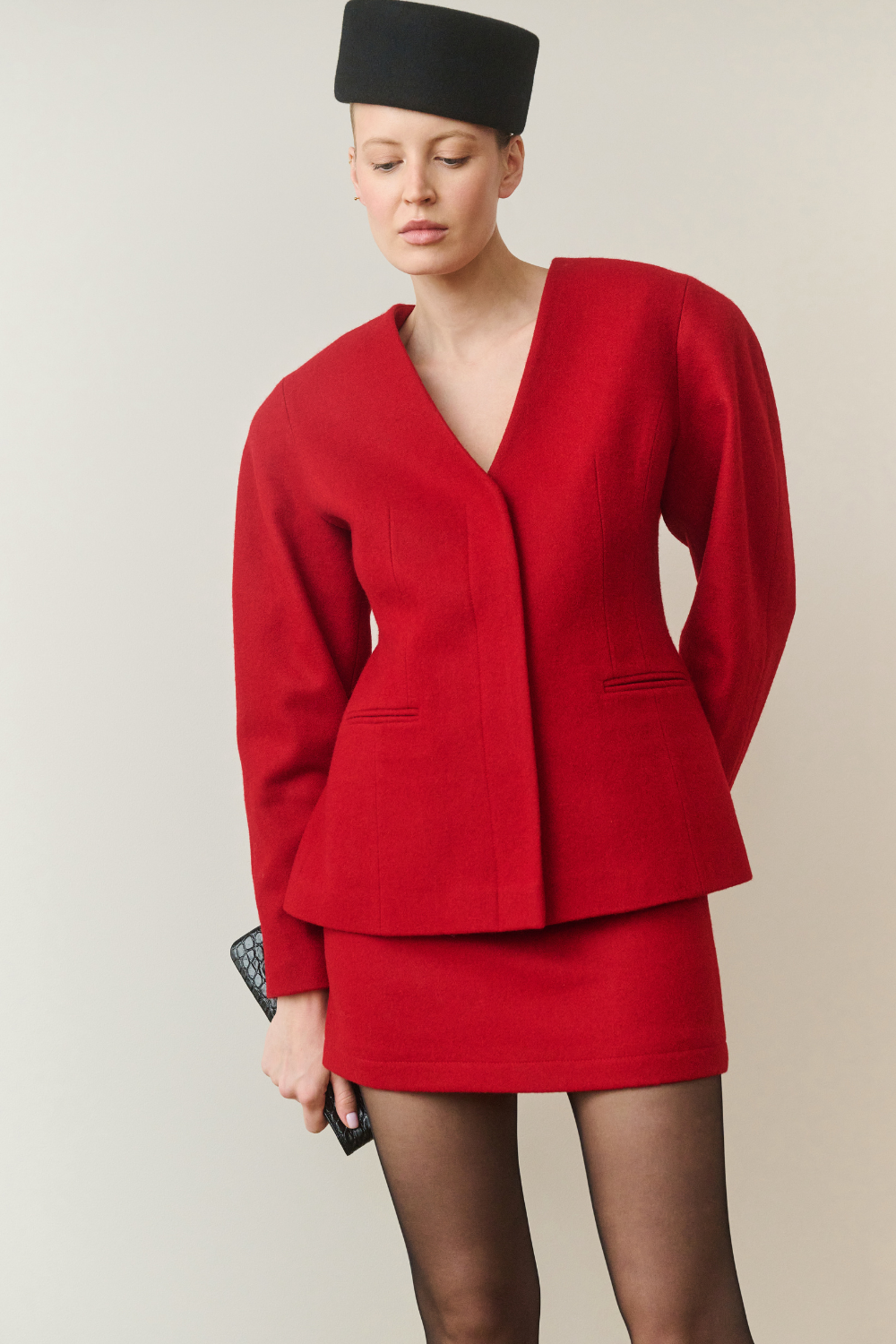 Noś ją samodzielnie jako kurtkę lub w komplecie z dopasowaną spódnicą, tworząc nowoczesny, kobiecy total look.