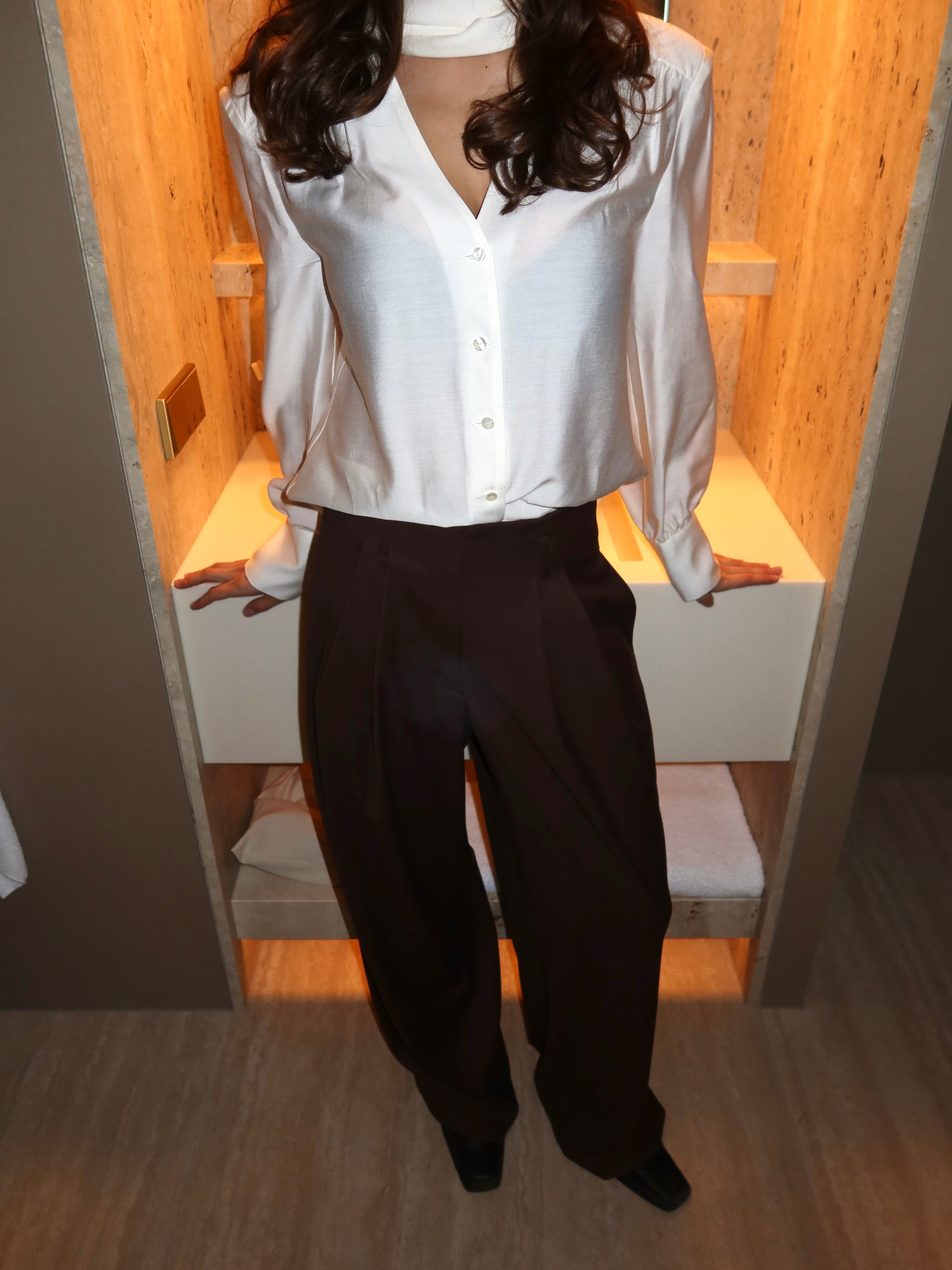 Kolor sprawia, że model wygląda luksusowo i ponadczasowo – to idealna baza do jasnych dzianin, koszul czy minimalistycznych topów. Sprawdzą się zarówno w stylizacjach bardziej eleganckich, jak i w codziennym, dopracowanym wydaniu.