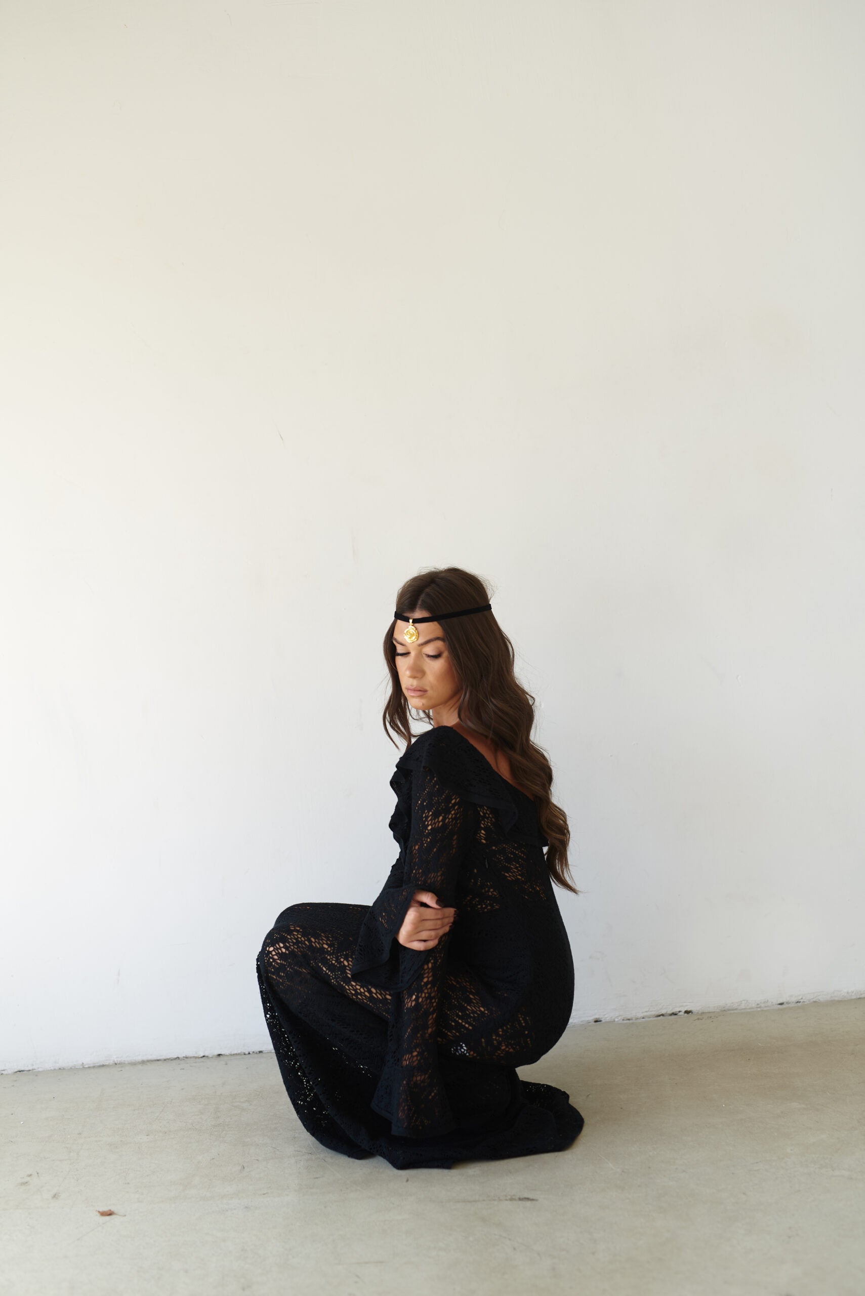 Sukienka RÊVE DE NOIR to romantyczna sukienka wykonana z czarnej koronki. Ma głęboki dekolt zdobiony falbanami oraz długie rękawy z ozdobnym zakończeniem. Sukienka jest dopasowana i delikatnie rozszerza się ku dołowi, co podkreśla sylwetkę. Idealna na wyjątkowe okazje.