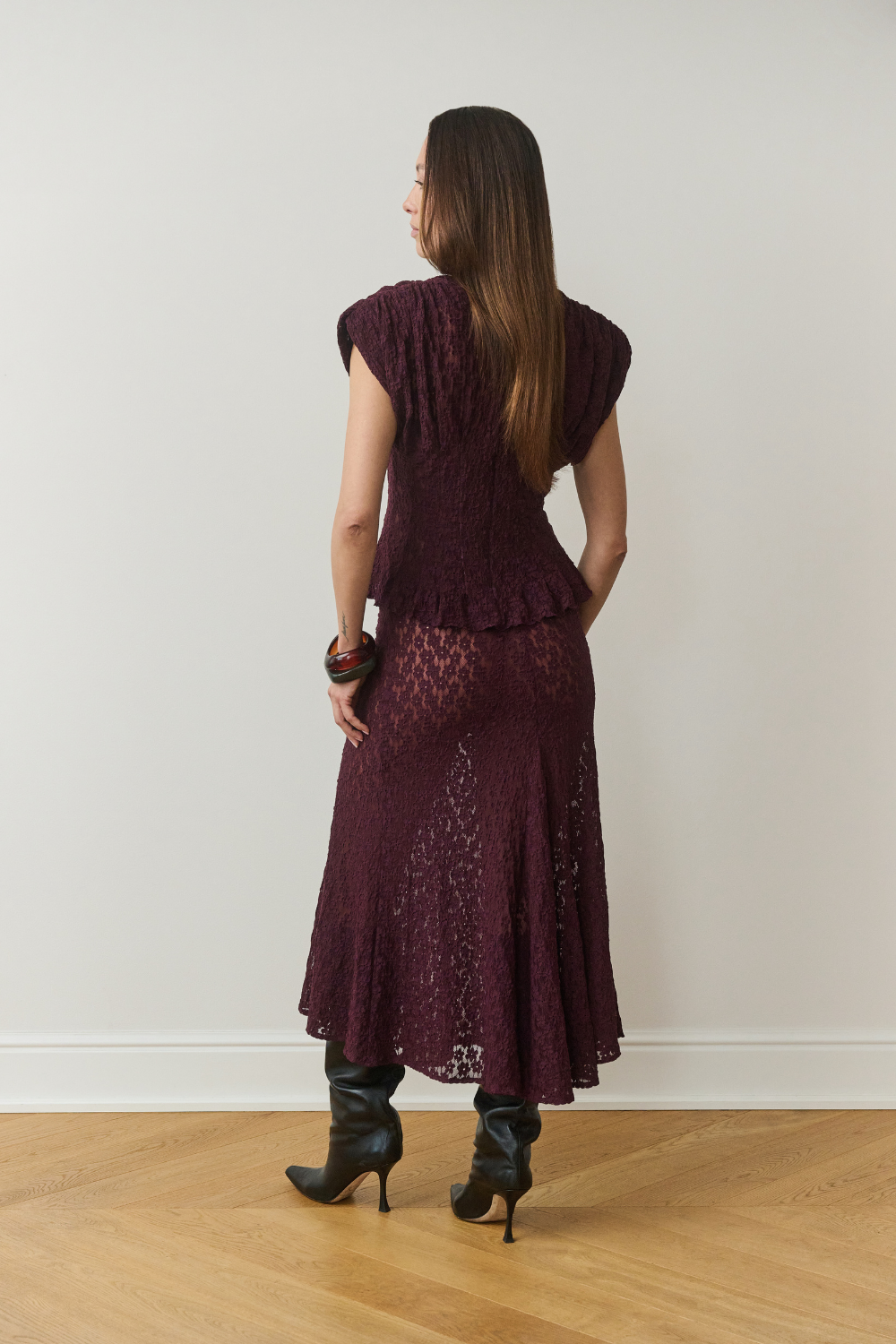 Uszyta z lekkiej, miękkiej koronki, zachwyca detalami – perfekcyjnym wykończeniem, starannym szyciem i ponadczasowym fasonem, który pięknie współgra zarówno z dopasowaną spódnicą, jak i klasycznymi spodniami.