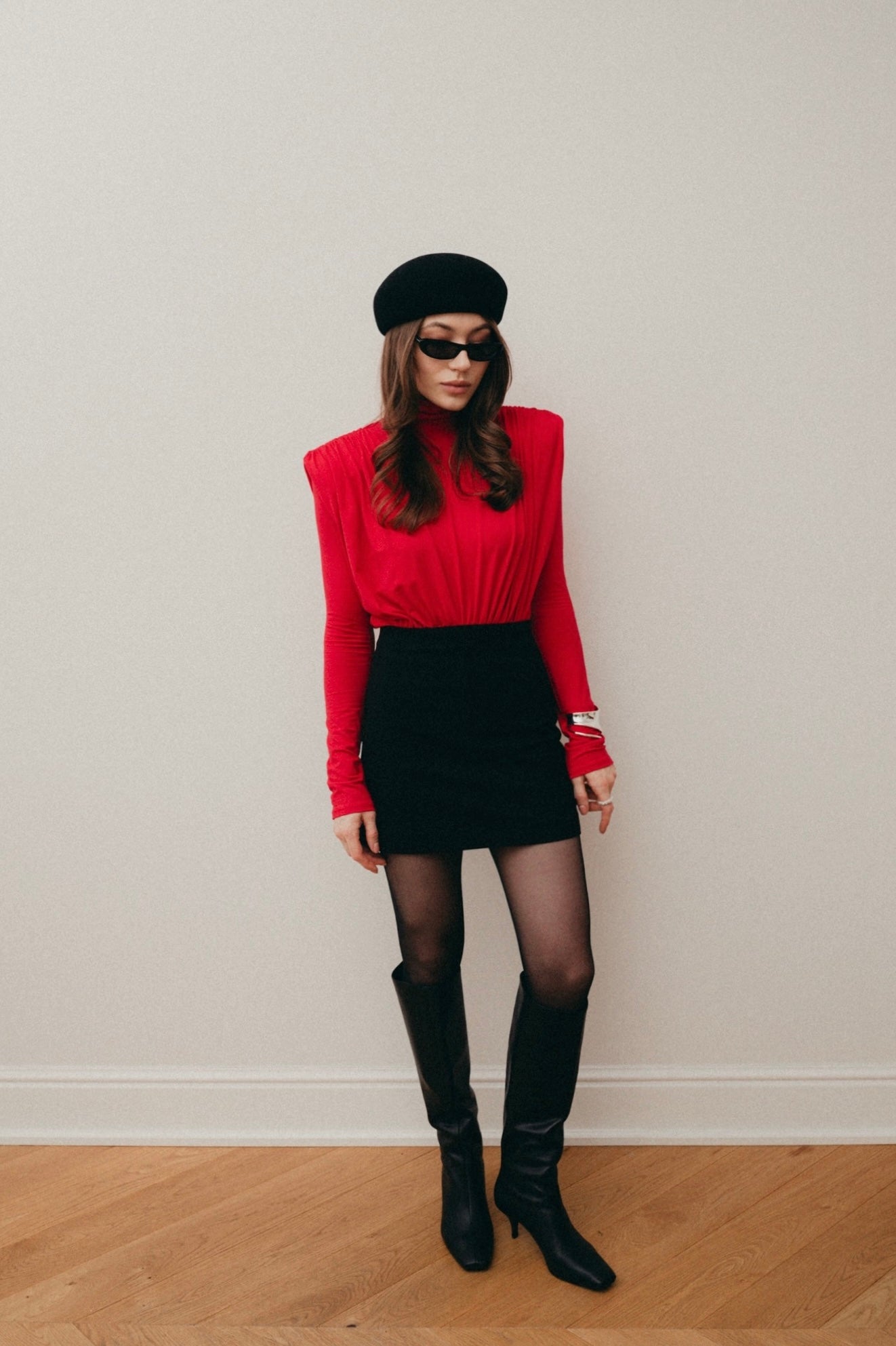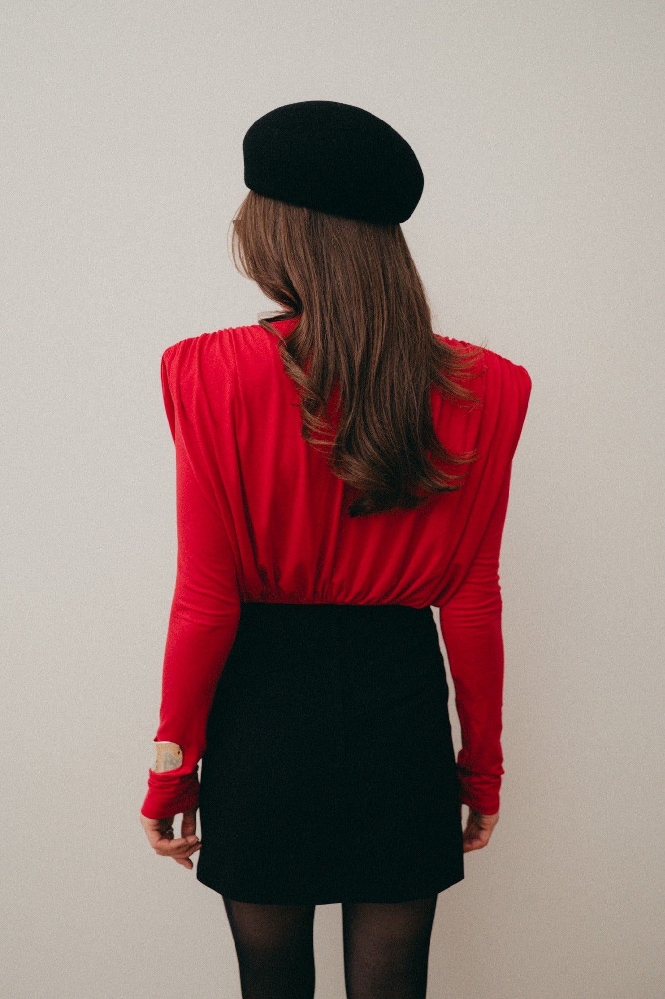 To eleganckie, czerwone body o dopasowanym kroju zachwyca efektownymi, drapowanymi ramionami oraz subtelnymi marszczeniami, które dodają sylwetce wyrazistego, modowego charakteru. Idealne do każdej stylizacji. To wyjątkowy model dla kobiet kochających klasykę, ale w nowoczesnym, odważnym wydaniu.