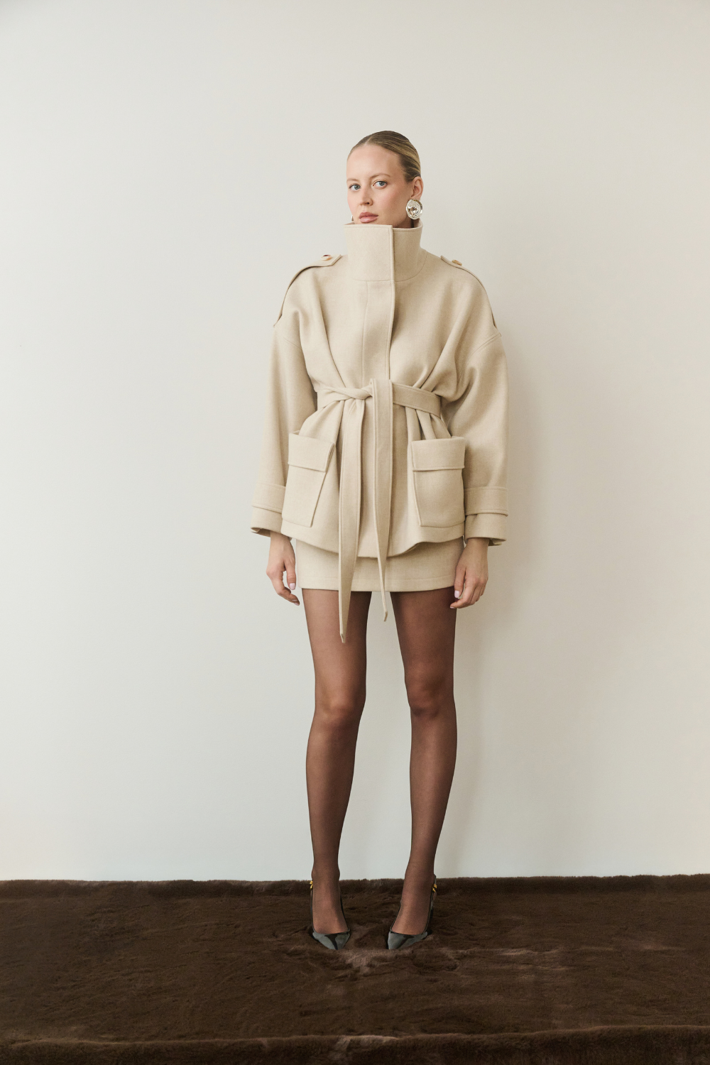 Jego dopracowany, ponadczasowy krój zachwyca w każdym detalu: szeroki kołnierz, subtelnie zaznaczone pagony, duże naszywane kieszenie i pasek podkreślający talię tworzą harmonijną całość. Płaszcz został starannie uszyty z dbałością o każdy szew, co widać w jego wyjątkowym wykończeniu i eleganckiej linii.