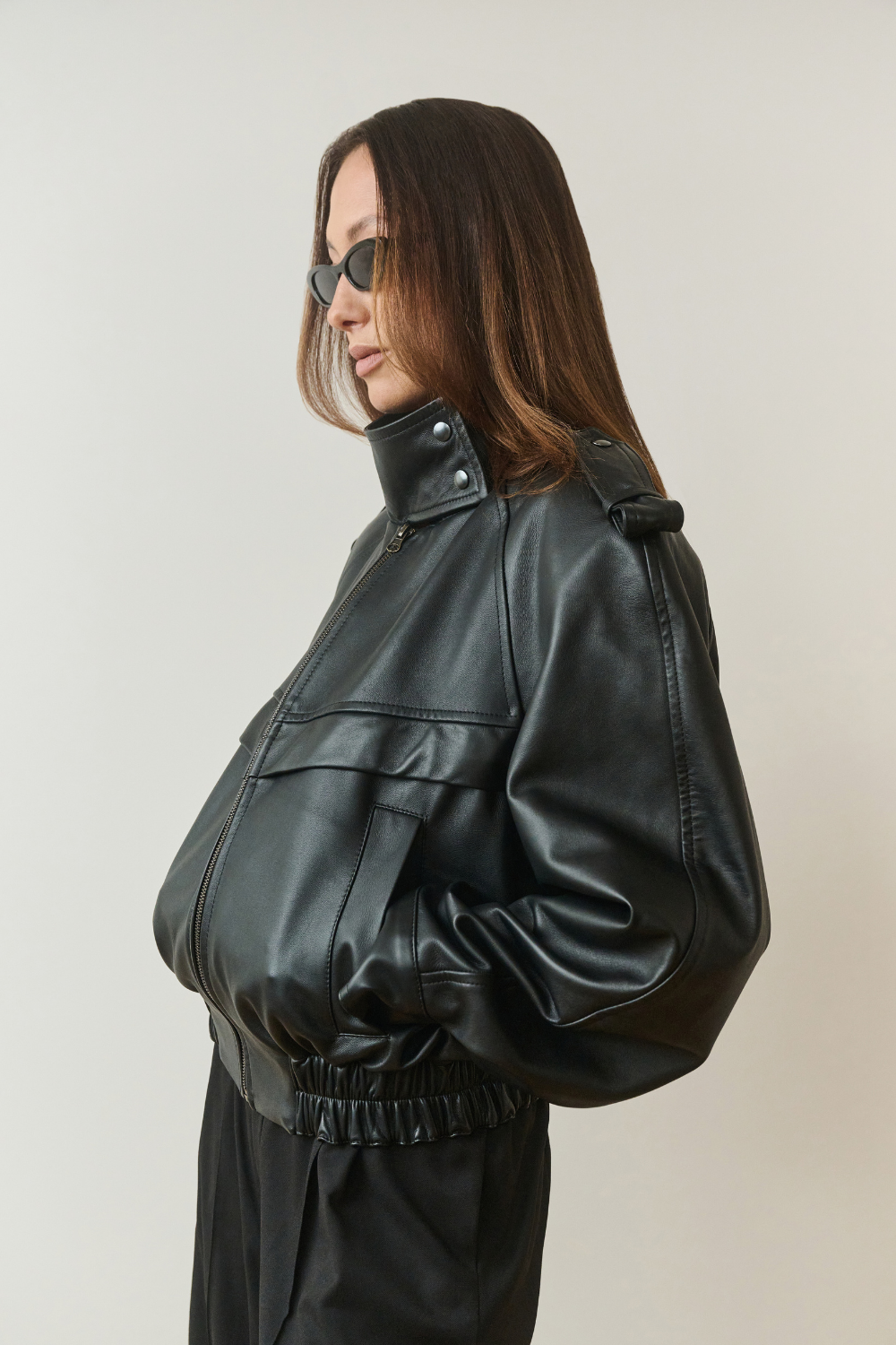 Minimalistyczny fason, głęboki dekolt i precyzyjne cięcia konstrukcyjne sprawiają, że Noir Leather Jacket to esencja współczesnej kobiecości – silnej, pewnej siebie, ale subtelnej.